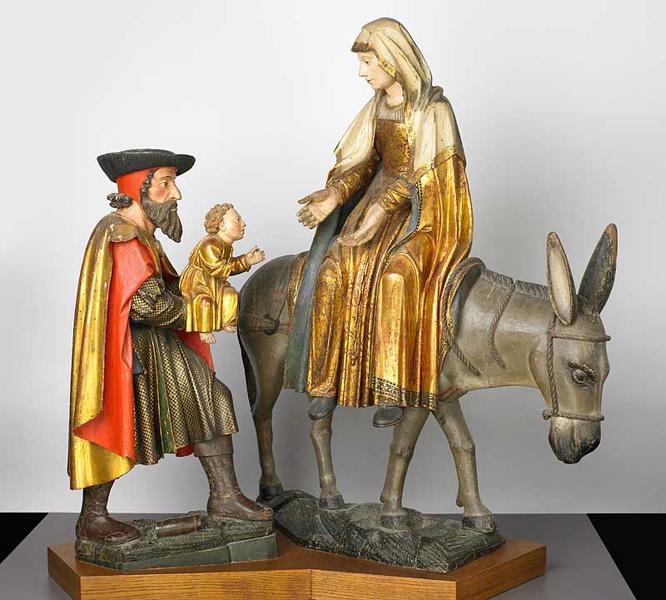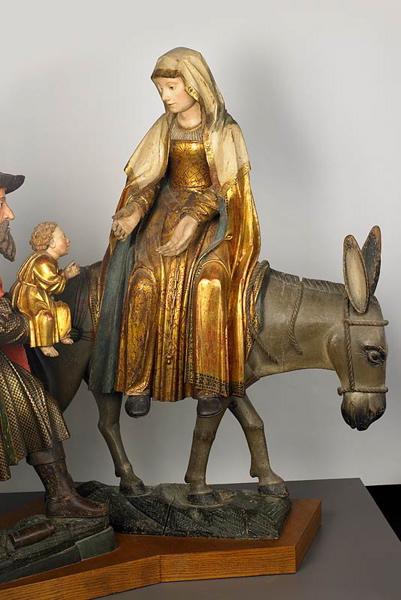groupe sculpté sur terrasses comprenant sur la terrasse de gauche Joseph présentant l'enfant Jésus à sa mère et sur la droite, Marie assise en amazone sur l'ânesse tendant les bras vers son fils