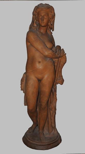 Amazone nue, debout, la chevelure et le dos couverts d'une peau de fauve; s'appuyant sur le côté droit sur un bouclier et une hache posés sur un tronc coupé