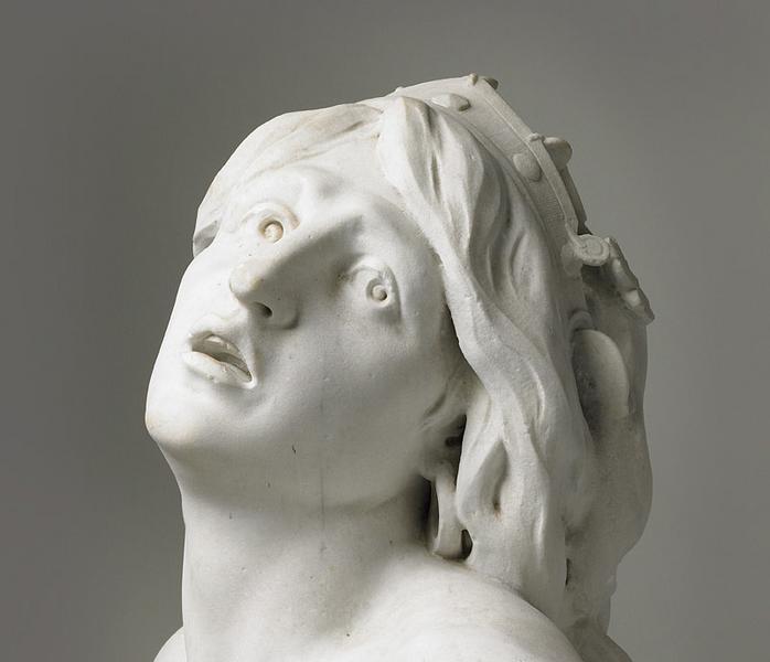 scène biblique (Jézabel : femme, nudité, allongé, douleur, couronne, boucle d'oreille, chien : agression animale) ; sur socle