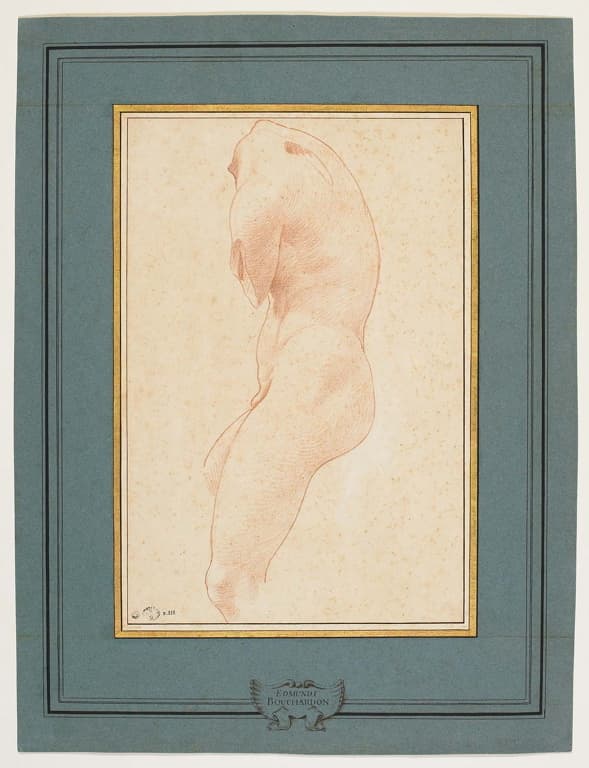 collection de Pierre-Jean Mariette (sa vente, Paris, 15 novembre 1775-30 janvier 1776), partie du lot 1145 ; Pierre Michel Avaulez, éditeur (actif 1772-1777) ; sa veuve, jusqu'à sa mort en 1779 ; Jean Gigoux ; legs Gigoux à Besançon en 1894.feuille d'étude d'un torse antique, Eros archer, copie romaine, d'après Lysippe ; d'autres dessins, du même modèle vu sous différents angles, sont conservés à Besançon (D.887, D.889, D.890)