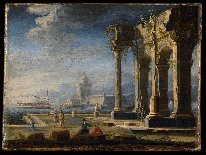 Dans le catalogue des peintures napolitaines de Besançon, ces deux vues de fantaisies [...] peuvent être rapprochées des deux Ruines (Tours, musée des Beaux-arts) que Boris Lossky, ancien conservateur de ce musée, attribue sur les conseils de Raffaello Causa, à la manière de Greco. L'écriture un peu timide et répétitive, l'aspect ' imagerie ' des deux uvres de Besançon correspondent mieux au style de Greco. La tendance visionnaire, le style déchiqueté, luministe qui caractérisent d'habitude les vedute de Coccorante sont absentes de ces deux petits paysages de fantaisie' (in BREJON de LAVERGNEE Arnauld (sous la dir. de), 'Peintures napolitaines du musée des beaux-arts et d'archéologie de Besançon', 1986, p.40-41, notice par A. BREJON de LAVERGNEE )