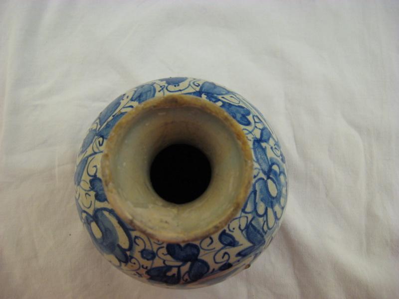 bouteille au décor de camaïeu de bleu sur fond blanc ; revers émaillé blanc