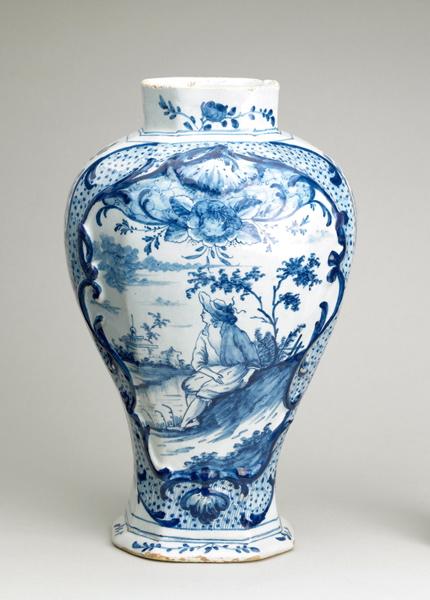panse : dans un cartouche rocaille, en relief, paysans assis au bord d'un canal regardant une fabrique sur l'autre baie; sur le côté opposé décor végétal; pied et goulot : décor végétal