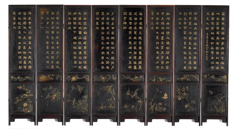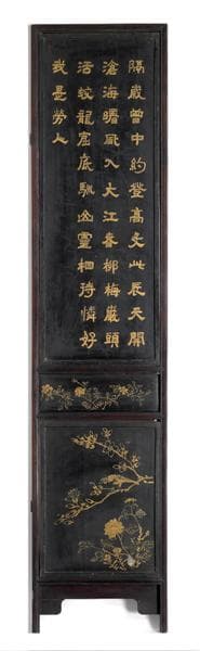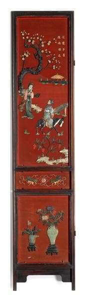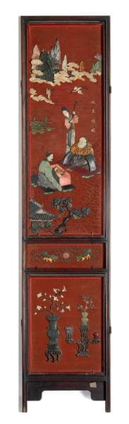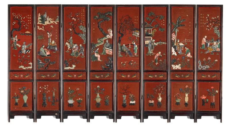 - I4.8 : sous un arbre, un vieillard assis dans un fauteuil; derrière lui, un serviteur apporte des rouleaux sur une table où se trouvent des instruments de dessin ou d'écriture; fleurs au premier plan sur chaque panneau : - petite inscription dorée - 2 petits griffons de part et d'autre d'un médaillon - 2 vases sur support contenant des fleurs; motif toujours différent 6 fragments de pierre et quelques fragments du fond