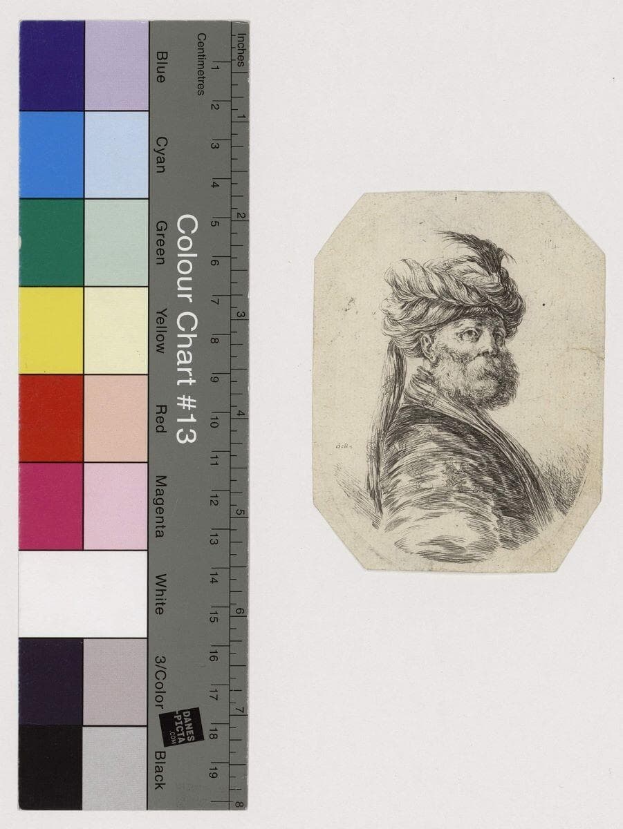 Turc à grande barbe, tourné de trois quarts vers la droite, avec turban orné d'une aigrette et un voile pendant le long de son dos