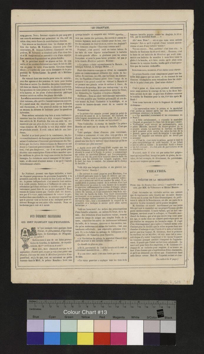 Publiée dans le "Charivari" du 18 septembre 1839. Cette lithographie publiée en page 3 du "Charivari", journal de quatre pages, à la rubrique du "Panthéon charivarique", montre Gigoux debout tenant palette et pinceaux. On lit quatre vers sous l'image : "Gigoux, au lieu d'exceller en peinture/ N'avait pour être un graveur achevé/ Qu'à travailler d'après nature/ Admirez en effet comme il est bien gravé". Cette caricature suit de peu la parution d'un nouvel ouvrage illustré par Gigoux : les "Lettres d'Héloïse à Abélard" publiées à Paris chez Houdaille, quelques années après l'énorme succès du "Gil Blas".