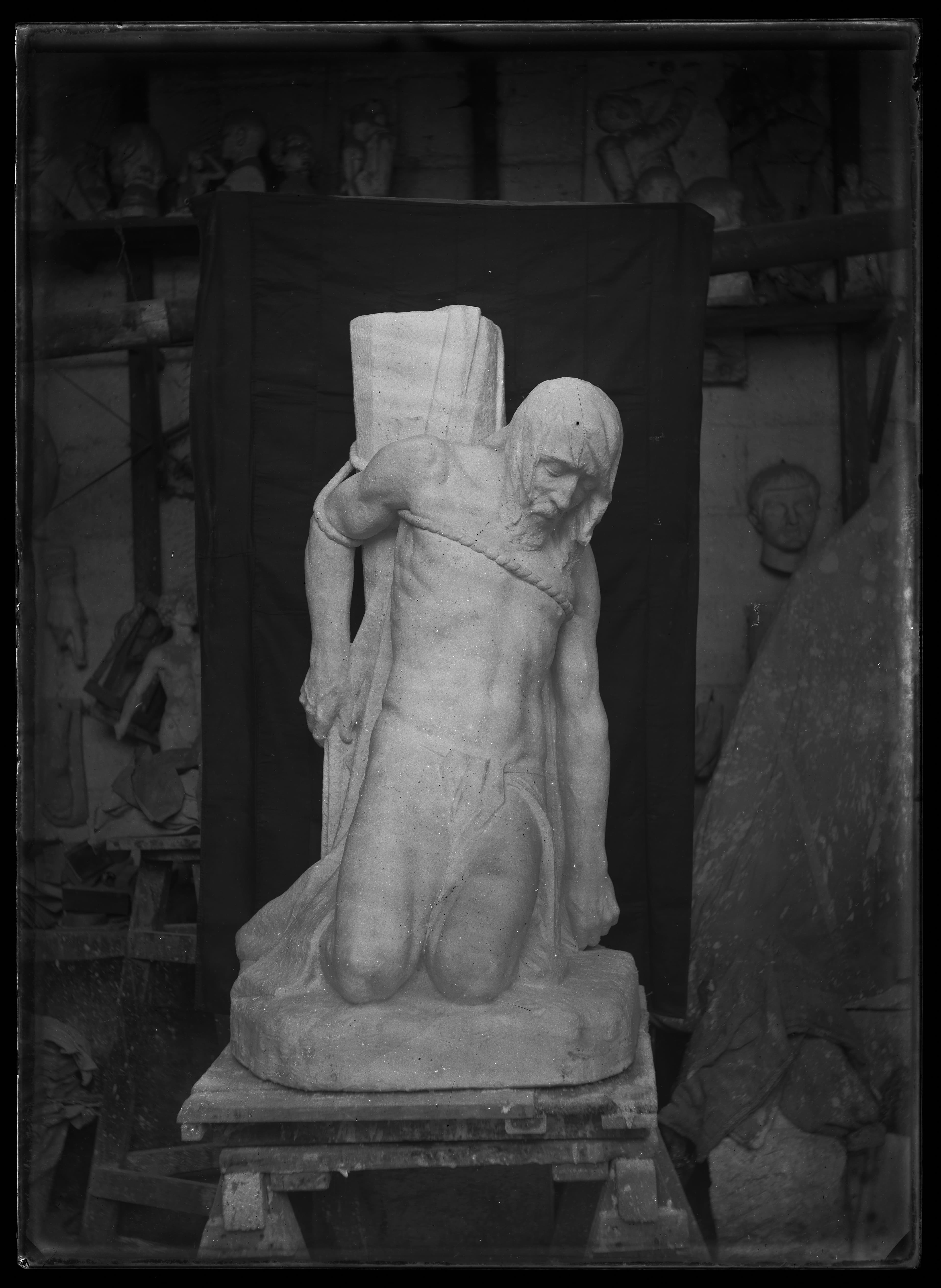 Groupe sculpté "Après la flagellation", photographié, de face, dans l'atelier