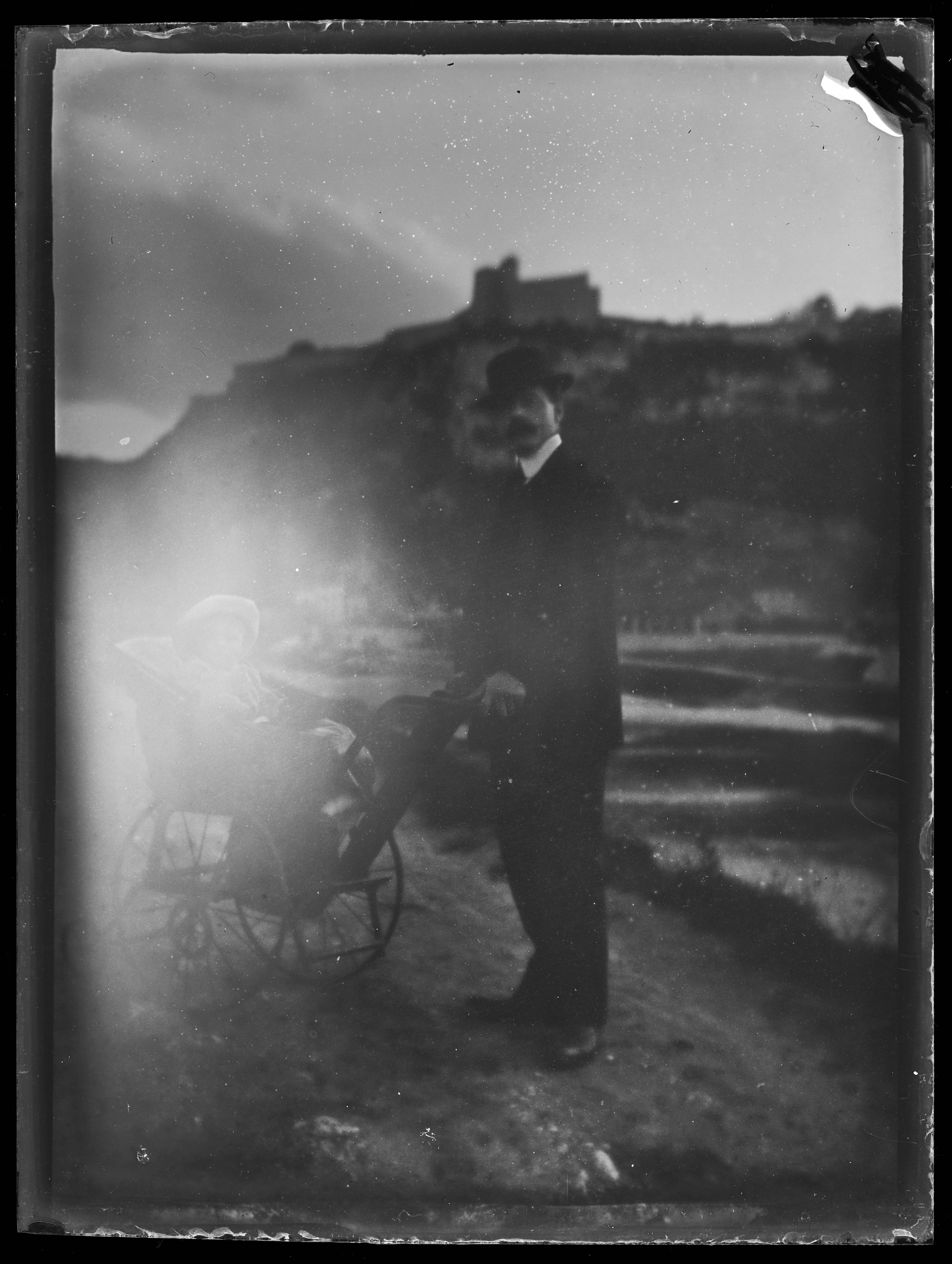 portrait ; famille ; homme ; enfant ; voiture d'enfant ; promenade ; rivière ; Doubs (rivière)