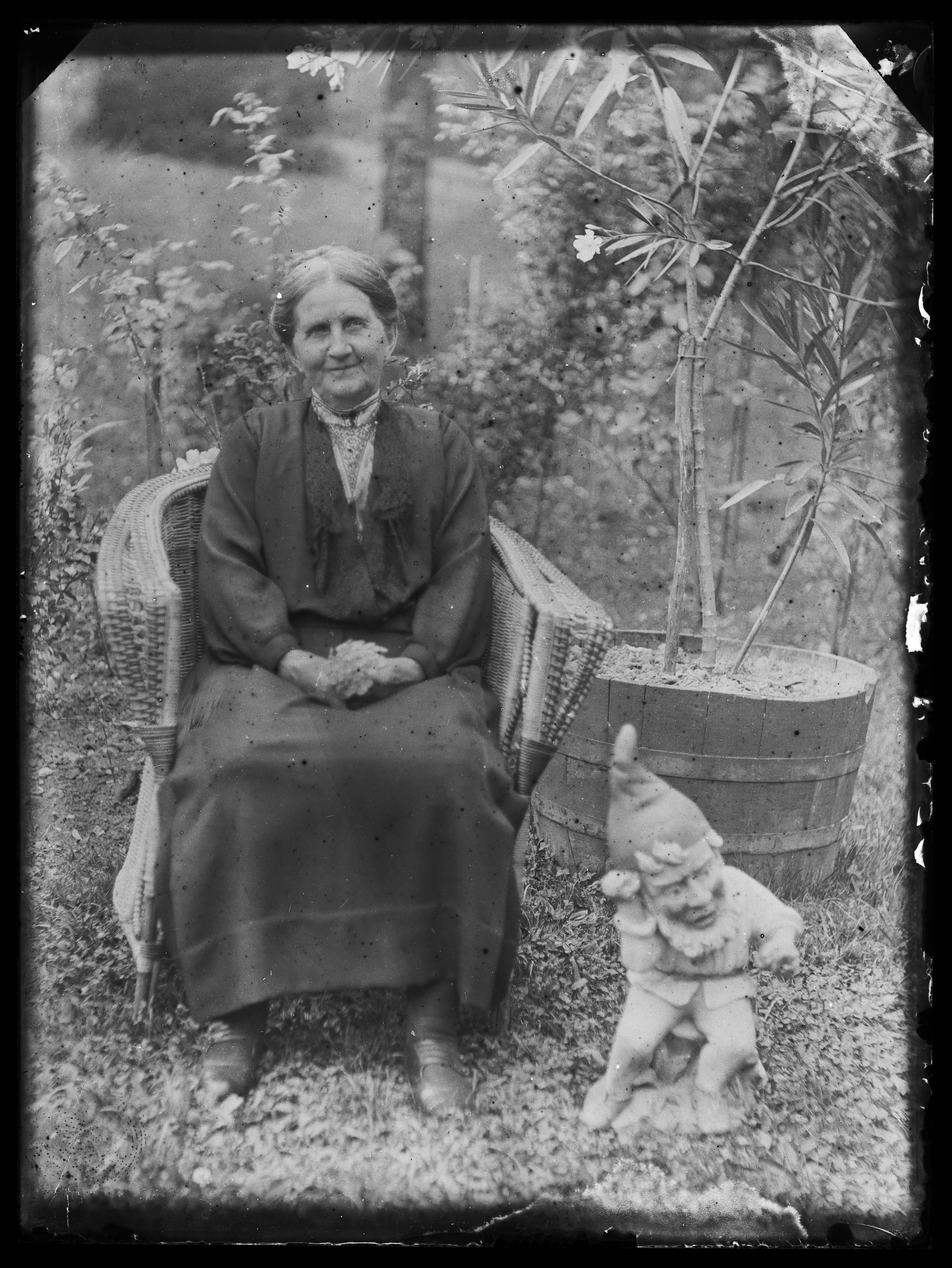 POP | Plateforme ouverte du patrimoinePortrait d'une femme âgée tenant des fleurs et posant dans un fauteuil d'osier, à côté d'un nain de jardin