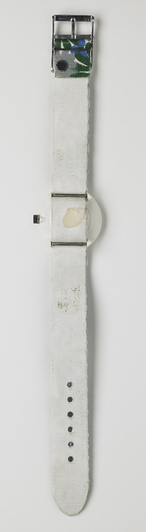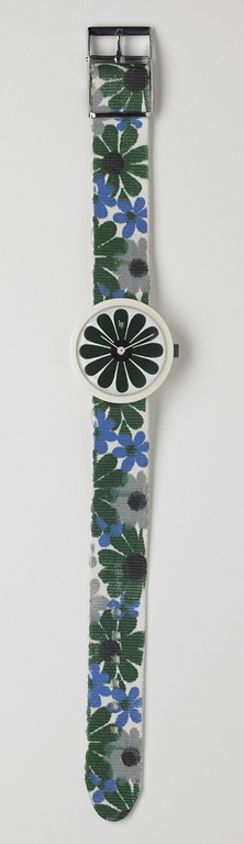 Montre-bracelet à mouvement mécanique T13 dessiné par Michel Boyer pour la collection Lip de 1975, série des Candides, dite "4 saisons", modèle Hiver. Montre bracelet à boîtier rond en Hostaform blanc (polymère), cadran à fond blanc décoré d'une fleur à douze pétales vertes foncées formant l'index de la montre, avec aiguilles de style bâton noires. Le bracelet est en tissu plastique (nylon?) blanc, sur lequel est imprimé côté visible un décor de fleurs vertes, bleues et grises. La série Candides comporte 14 modèles : 4 modèles fleuris et 10 aux couleurs franches. Elle se reconnait à ses boîtes en Hostaform, un plastique qui permet à l'époque un tarif très abordable de 140 francs. Ces créations sont perçues comme préfigurant la Swatch qui voit le jour 10 ans plus tard. ; Boîte en Hostaform, un polymère