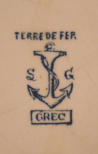 au dos : TERRE DE FER, S G, GREC ; ancre marine. L'ancre marine est le sigle de la faïencerie de Clairefontaine (Haute-Saône). Le terme Grec correspond au modèle de l'assiette.