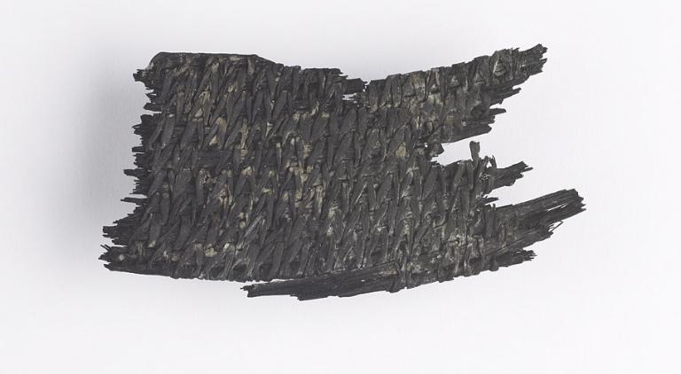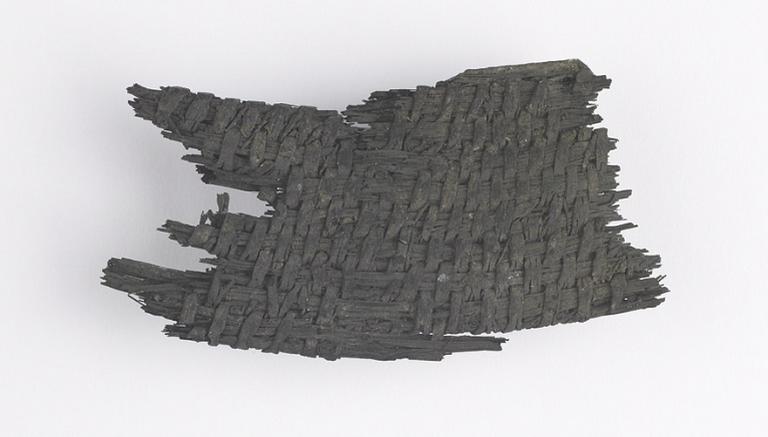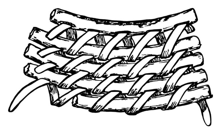 Vannerie à cordon disposé en spirale. Le lien se développe en hélice en suivant le sens des cordons. L'aiguille est passée de manière à ne jamais rencontrer le lien de couture de la rangée précédente