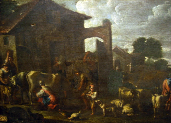 scène (ferme, personnage, vache, chèvre, poule, chien) ; fond de paysage