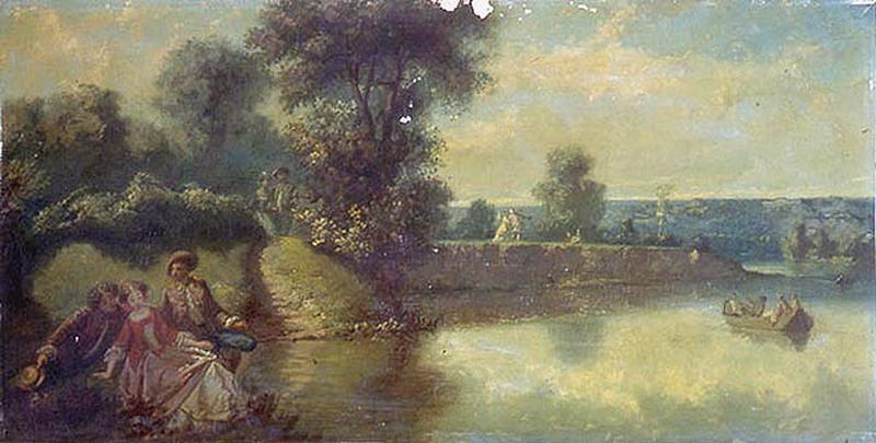 scène (galanterie, homme, femme, costume : 18e siècle) ; fond de paysage (Meudon, berge, arbre, rivière, barque)