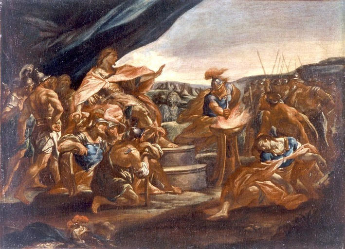 scène (bataille, Mucius Scaevola, soldat, roi, tenture, arme) ; fond de paysage (montagne)