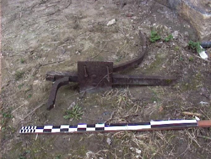Support d'une passerelle permettant d'accéder à la vanne installée sur la Furieuse (démontée dans les années 1950 par M. Legouhy). La barre horizontale et la platine servaient de support au tablier de la passerelle, la petite barre coudée de montant au garde-corps, et la barre cintrée servait probablement de console à la passerelle.