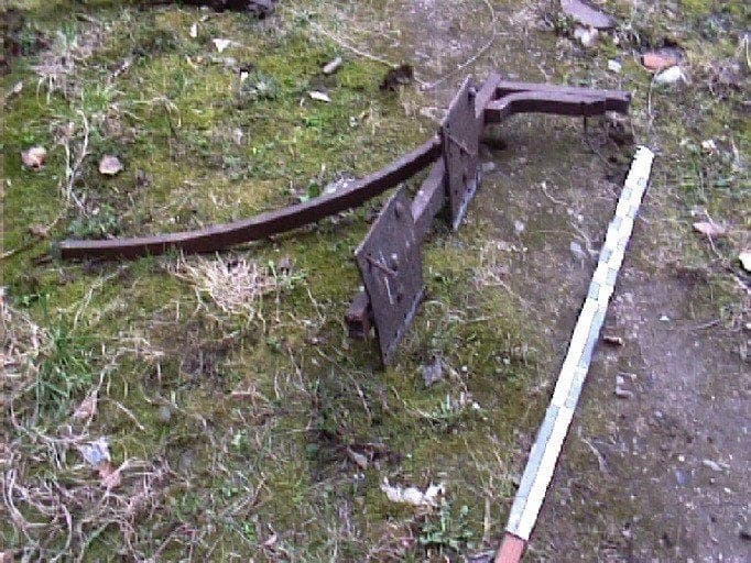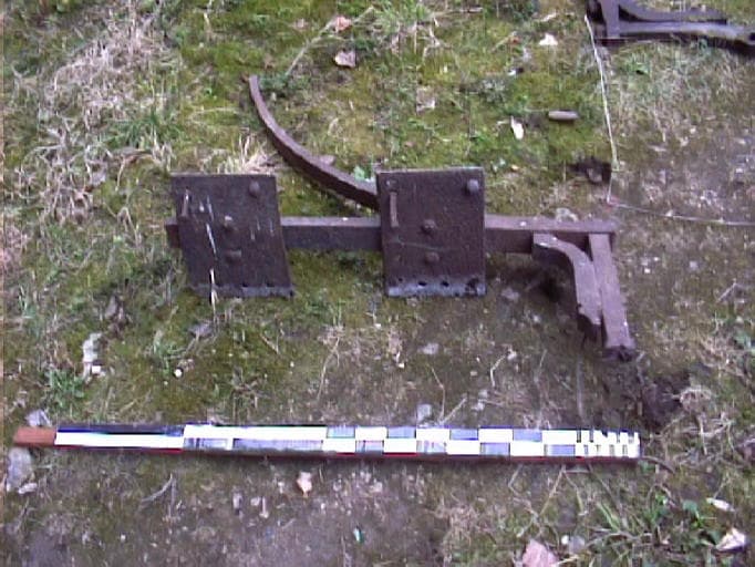 Support d'une passerelle permettant d'accéder à la vanne installée sur la Furieuse (démontée dans les années 1950 par M. Legouhy). Le plan horizontal constitué d'une barre droite et des deux platines correspondait au support du tablier de la passerelle. Les deux petites barres jointes représentent la base d'un montant du garde-corps, la barre cintrée est probablement un élément d'une console de la passerelle.