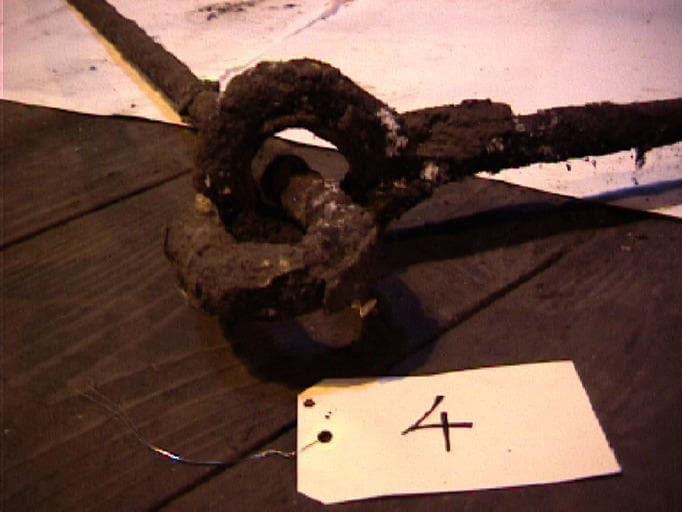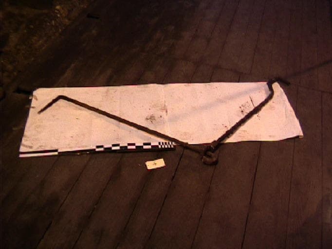 Système de maintien d'une poêle par traction. Le crochet à angle droit se plaçait sur le rebord de la poêle, la pointe de la seconde tige s'enfonçait dans le sol.