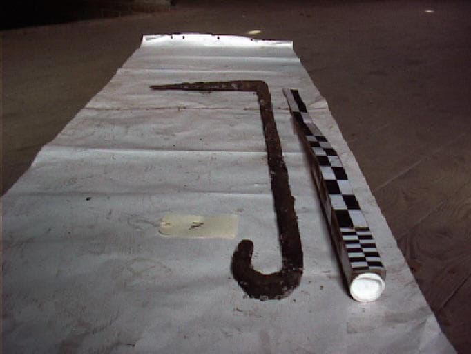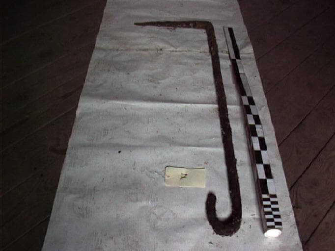 Système de maintien d'une poêle par traction. La pointe coudée était enfoncée dans le sol. La boucle arrondie servait d'articulation avec l'anneau d'une seconde tige pourvue d'un crochet fixé sur le bord de la poêle.