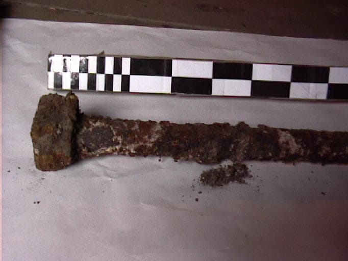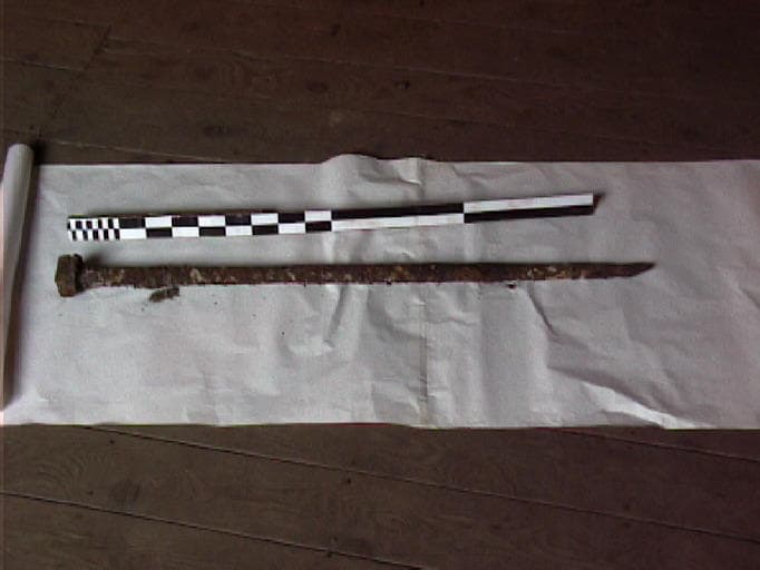 Système de maintien de la poêle par traction. La fiche, enfoncée dans le sol, passait par l'anneau d'une tige fixée au bord de la poêle par un crochet à angle droit.