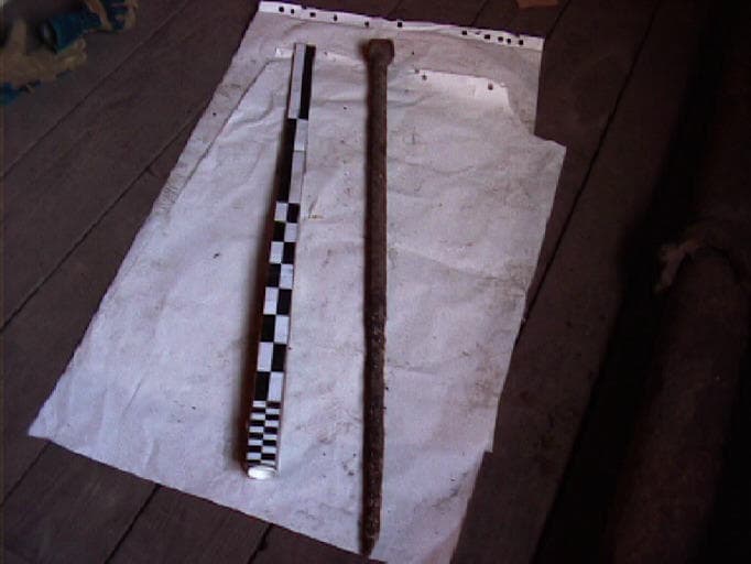 Système de maintien de la poêle par traction. La fiche, enfoncée dans le sol, passait par l'anneau d'une tige fixée au bord de la poêle par un crochet à angle droit.