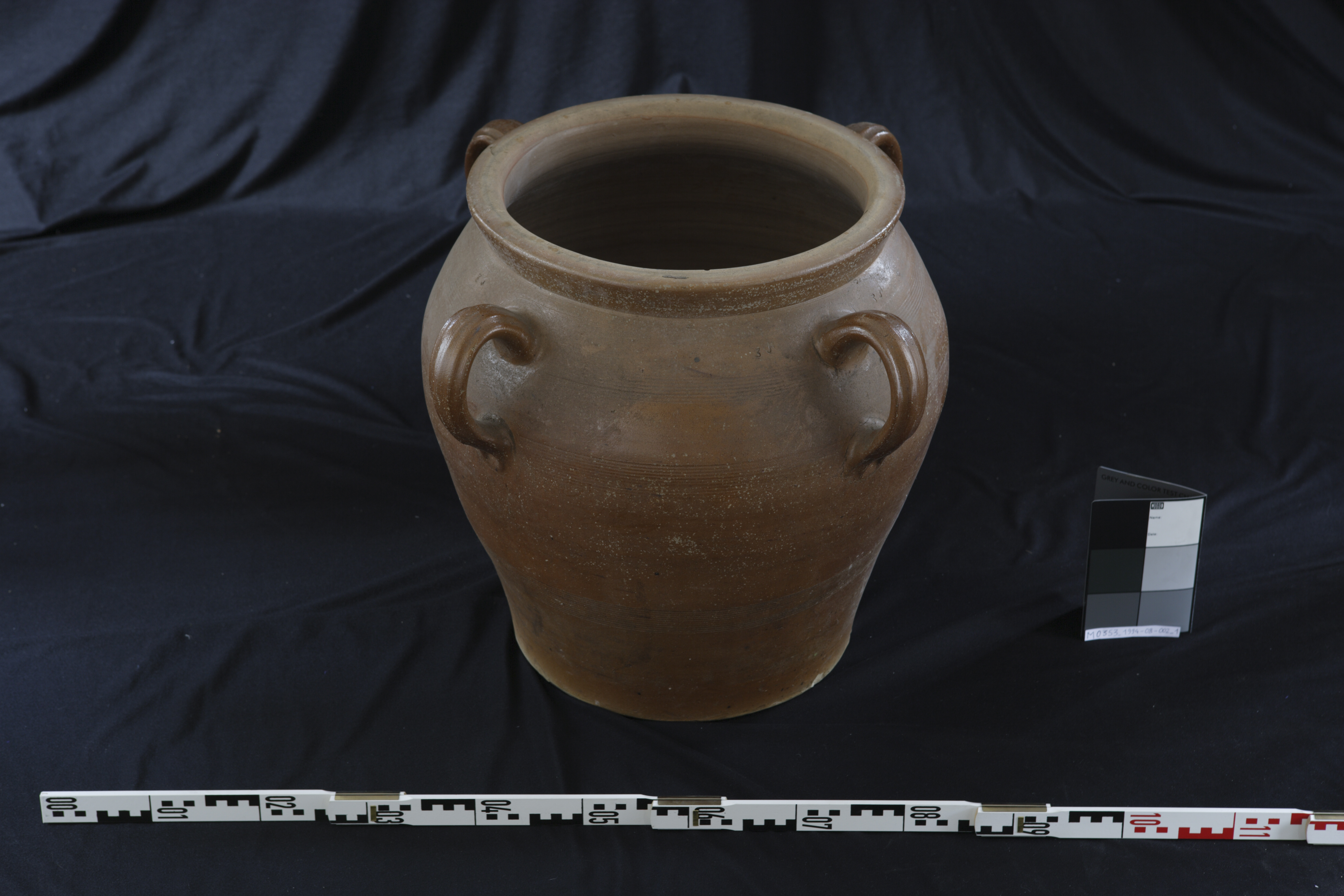 Jarre bombée pourvue de quatre anses (oreilles). Grès ancien, vernissé au sel