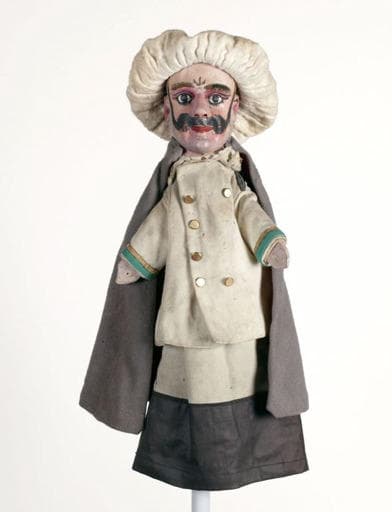 Objet créé pour le Guignol Lorrain, compagnie de marionnettes de Lunéville. Don n°149 dans les cahiers d'Albert Demard 'un lot de 64 marionnettes et 2 malles'. ; voir aussi : 1951.3.16 (b)