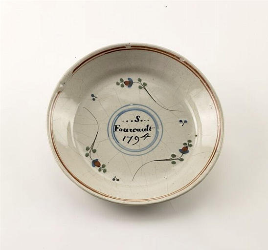 Assiette en faïence stannifère de forme écuelle, à aile large (absence de marli) recouverte d'un émail blanc, craquelé, sur terre ocre-rouge (absence d'émail sur les pernettes et éclats). Elle est ornée d'un décor de grand feu : au centre, un médaillon, délimité par un triple liseré bleu, porte l'indication suivante ...S...,Fourcault,1794. Le fond du bassin est également pourvu de tiges de fleurs stylisées. Le bord de l'aile est orné d'un double liseré rouge brique. Au verso : les 3 traces des pernettes, aucune marque et sans talon (forme arrondie du bassin)