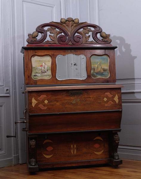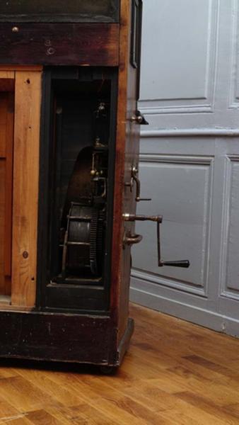 Le meuble fermé est composé de trois volumes sur la face antérieure. La partie haute, en retrait par rapport à la partie centrale reçoit en son centre un miroir galbé entouré de part et d'autre de deux réserves dans lesquelles sont placées deux marines peintes sur toile. Celle de gauche représente deux voiliers au lever du soleil avec des oiseaux alors que celle de droite représente un seul voilier dans le même style de paysage. L'ensemble est surmonté d'une forme végétale stylisée en ronde-bosse ajourée ornée de courbes et contre-courbes. Certains boutons et feuilles végétales étaient dorés. La face de la partie centrale est sculptée de reliefs en creux. De part et d'autre, des bandeaux entrelacés stylisés cernent des motifs de figures polygonales à six éléments remplis peints de couleur cuivre/rouge ainsi qu'un hexagone et une figure à quatre éléments peints de couleur dorée. Au centre, un relief en creux représente une composition d'instruments de musique où figurent un tambour, un cor et une partition enroulée. Au-dessus, est clouée une plaque métallique noire avec une inscription dorée 'HARMONIPHONE MANUFACTURE D'INSTRUMENTS DE MUSIQUE 10, rue Carnot REIMS' et plus bas 'F. EBAUDY REIMS'. Un ruban et une plume semblent lier le cartouche et la composition d'instruments. Le bas de la partie centrale, galbé, est souligné par deux moulures simples noires et ne reçoit pas d'ornementation. elle est supportée par deux pieds galbés en accolade avec des motifs sculptés en haut relief en forme de fleur à quatre pétales et à coeur guillochés. Le panneau central de la partie basse est en retrait par rapport aux pieds. L'ornementation est semblable au style de la partie intermédiaire avec au centre un motif en forme de violon très stylisé et un ruban qui l'entoure. Le côté latéral gauche reçoit plusieurs pièces métalliques dont un cadre avec aiguille avec les chiffres de 0 à 9, trois manivelles de tailles diverses (une pour accélérer ou ralentir, une pour le carillon), une anse de préhension horizontale, une fente en haut à droite pour insérer des pièces et un cadre mouluré en bois vitré dans lequel sont inscrits à la plume et manuscritement les titres de dix airs de musique (1. Valse. Tout est parfum. Staz ; 2. One step. Quand les femmes seront soldats ; 3. Java. Rue de Paname. Pascal ; 4. Boston. Vestale. Porret ; 5. Fox blues. Afghafessa. Mazot ; 6. Charleston. Plane in Spain. Lewis ; 7. Valse Elegante. Porret ; 8. Java. Et tout ça. Malderen ; 9. Two step. Pacile. Porret ; 10. Scottish Espagnole. Cristalina. Hoz) Le côté latéral droit reçoit une targette métallique indiquant 'Piano ou mandoline' ainsi qu'une autre anse de préhension. Une pièce en bois ronde est accolée sur ce côté. A l'arrière du meuble, le cadre de bois de l'instrument est visible ainsi qu'une partie du mécanisme. L'ensemble repose sur des roulettes