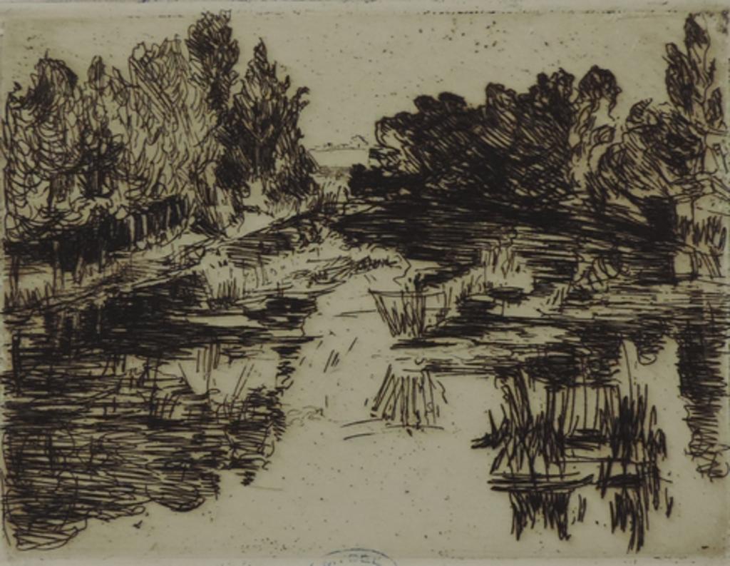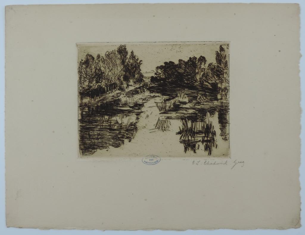 inscription concernant l'exécutant, en bas à droite, au crayon graphite : E. L. Chadwick - Grez - tampon, en bas au centre : MUSEE / DE / NEMOURS ; au dos de la gravure : Société des Amis du Vieux Château de Nemours numéro 1685-2° inscription concernant l'acquisition, au dos de la gravure, au crayon graphite : Le Loing à Grez / par E. Chadwick / Don de l'auteur au Vieux Château / 25 août 1923