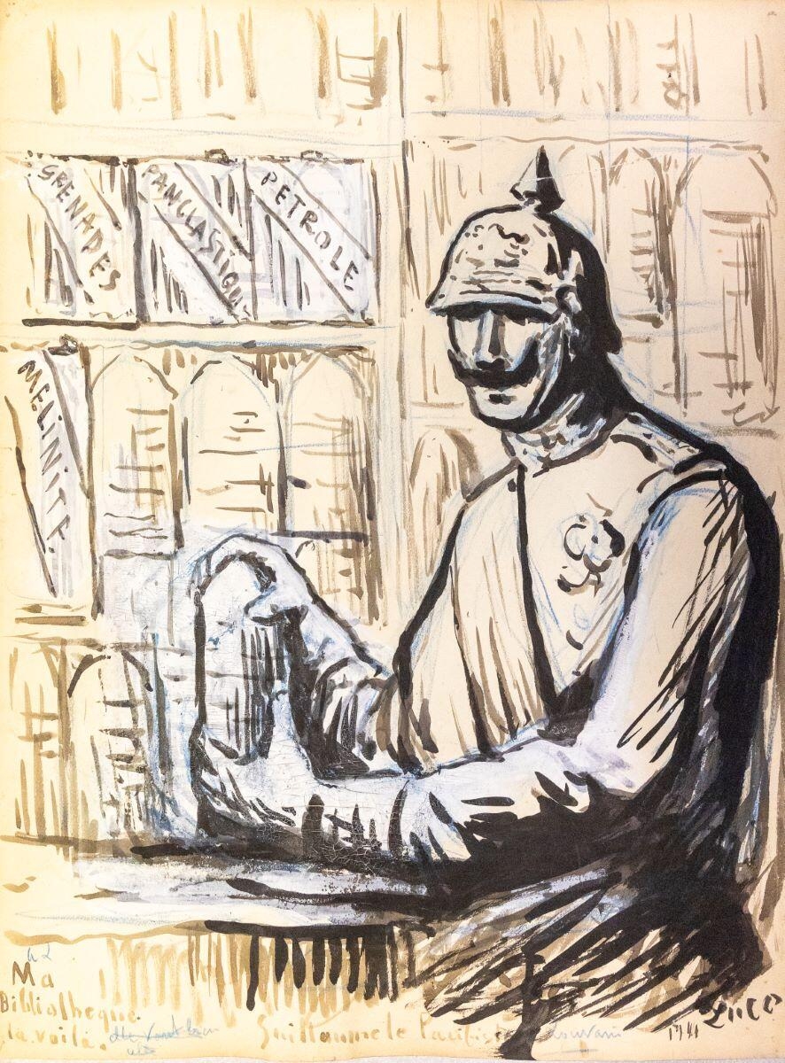 Un militaire prussien portant un casque à pointe et une moustache aux pointes très relévées, caractéristique de l'empereur allemand Guillaume II, se tient devant une bibliothèque d'obus et en tient une dans ses mains.