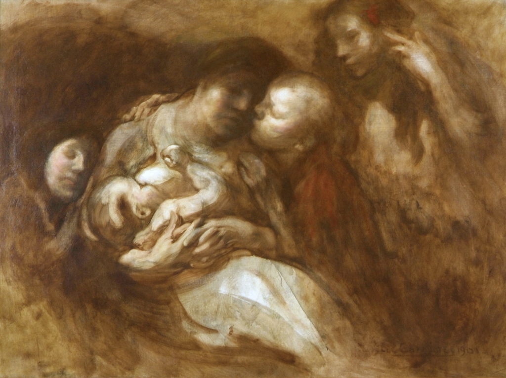 Maternité : la scène comporte cinq personnages, la mère et quatre enfants. On peut reconnaître, embrassant sa mère, Jean-René, alors âgé de treize ans ; appuyée à la droite de sa mère, Lucie à douze ans ; le bébé serait Arsène, née en 1899, et la jeune fille debout sur la droite pourrait être Nelly à quinze ans. Cette grande toile paraît inachevée, dans la mesure où les bords sont à peine couverts. Certaines zones sont balayées de longues bandes de peinture noire délavée, ce qui donne à l’oeuvre l’aspect d’une ébauche, d’autant plus que des traits de crayon sous-jacents apparaissent. Mais de très courtes touches de noir apportent une animation. Les visages sont rehaussés de rose posé en aplats. En haut à gauche, une vaste zone foncée donne une impression de profondeur et suggère le monde alentour. La composition est très élaborée. La mère, ici l’air accablé, tout en allaitant un bébé, incline la tête vers son fils, qui entoure ses épaules de son bras droit. Ses mains croisées autour du bébé indiquent que là est située son activité principale, où elle est comme enfermée, indépendamment des autres personnages. Comme souvent, le corps du bébé est éclairé, ainsi que les mains et le sein maternels. À ce groupe initial s’ajoute la figure du garçonnet, serré contre sa mère. Sa tête dépourvue de cheveux et également éclairée, fait pendant à celle du bébé et au sein qu’il téte. Ce personnage se distingue par la couleur pourpre de son vêtement, assez inhabituelle dans l’oeuvre de Carrière, ce qui renforce l’importance de son rôle. Deux autres filles flanquent ce duo, puis trio central : à gauche, une enfant les yeux fermés, collée elle aussi contre le bras de sa mère ; plus loin à droite, comme spectateur, l’adolescente Nelly, dont le bras se pose sur sa propre chevelure quasiment rousse. Ici le thème du baiser et celui de l’allaitement sont mêlés. Les rapports initiaux ont évolué, et, bien que nourricière, la mère bénéficie du soutien de ses enfants, qui vivent avec elle dans le même univers apparent de souffrance partagée. L’oeuvre, traitée en mouvements amples et courbes, ne comporte plus le même aspect dramatique que dans les années 90, mais le poids de la réalité semble plus grand.
