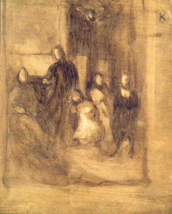 Le compositeur Ernest Chausson (1855-1899), qui avait été l'élève de Massenet et de Franck, était lié avec de nombreux musiciens, écrivains et peintres de l'époque. Son Salon de la rue de Courcelles à Paris était fréquenté par Debussy, Fauré, Vincent d'Indy, Mallarmé, Puvis de Chavannes, Degas et Monet. Il possédait d'ailleurs une collection de toiles impressionnistes et symbolistes. C'est par l'intermédiaire de son beau-frère Arthur Fontaine, lui-même lié à Henry Lerolle, et du compositeur Raymond Bonheur que l'auteur du Roi Arthus qui avait aussi mis en musique Maeterlinck ou Tourguéniev rencontra Carrière. Carrière, déjà célèbre pour ses maternités, devait alors paraître comme particulièrement qualifié pour exécuter des portraits de famille. Son tableau La famille du peintre, exposé en 1893 (Musée d'Orsay), favorisa sûrement ce jugement. Celui de La famille Chausson est un exemple extrême, par le nombre de personnages qui l'apparente, toutes proportions gardées, aux Ménines de Vélasquez. Le tableau définitif (278 x 237 cm) resta jusqu'en 1952 dans cette famille, avant d'être offert au Musée de Lyon (inv. 1952-22). Carrière réalisa plusieurs études et esquisses peintes, afin de mettre en place la composition. On connaît aussi des études isolées d'Ernest Chausson, de sa femme Jeanne, et de leur fille Etiennette, donnés pour certains par Carrière à la famille Chausson en 1895. Il eut le souci de regrouper harmonieusement les cinq personnages à l'aide de courbes traduisant leurs liens affectifs. Ils sont présentés de face, dans un intérieur à l'architecture stricte, mais Carrière a hésité à faire figurer assis l'un des parents. Sur l'esquisse de Saint-Cloud, le format a été corrigé. Sur la version définitive la robe blanche de la mère est le centre du tableau, d'où jaillit la lumière, la vie, ce que ne laisse pas présumer notre esquisse. À la réception de l'oeuvre, Chausson écrivit à Carrière : ' Notre tableau est placé. Il fait admirablement et j'ai un plaisir tout particulier à le regarder. D'abord c'est un chef-d'oeuvre, et puis il me rappelle des heures d'intime causerie qui m'ont été précieuses. Je lui suis reconnaissant de l'amitié que vous avez bien voulu me témoigner. Croyez que mon admiration pour votre peinture se double d'une vive affection pour vous ' (Musée du Louvre, MS 425 (2)).