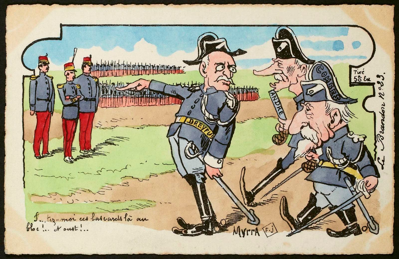 Au recto, dans l'angle inférieur gauche, en caractères manuscrits à l'encre noire : F...tez-moi ces lascards là au bloc! ... et oust !... ; (Au recto, en partie basse à droite, en caractères manuscrits à l'encre noire, les initiales étant inscrites dans un losange) MYRRA F. J. ; (Au recto, verticalement le long du bord droit et horizontalement au dessus pour le tirage) Le Brandon n° 23 / Tiré à 50 Ex. ; (Au recto, en caractères manuscrits à l'encre noire, sur la ceinture dorée du personnage de gauche au premier plan) DREYFUS ; (Au recto, en caractères manuscrits à l'encre noire, sur le canon du pistolet du personnage du milieu du groupe au premier plan) ANDRE ; (Au recto, en caractères manuscrits à l'encre noire, sur le bicorne du personnage de droite au premier plan) COMBES ; (Au verso, en caractères dactylographiés à l'encre noire, en haut en partie médiane, la seconde ligne étant en italique) CARTE POSTALE / Ce côté est exclusivement réservé à l'adresse ; (Au verso, en caractères dactylographiés à l'encre noire, avant quatre lignes de pointillés) M. ; (Au verso, dans l'angle inférieur droit, inscription manuscrite au crayon graphite) 2014.2.10