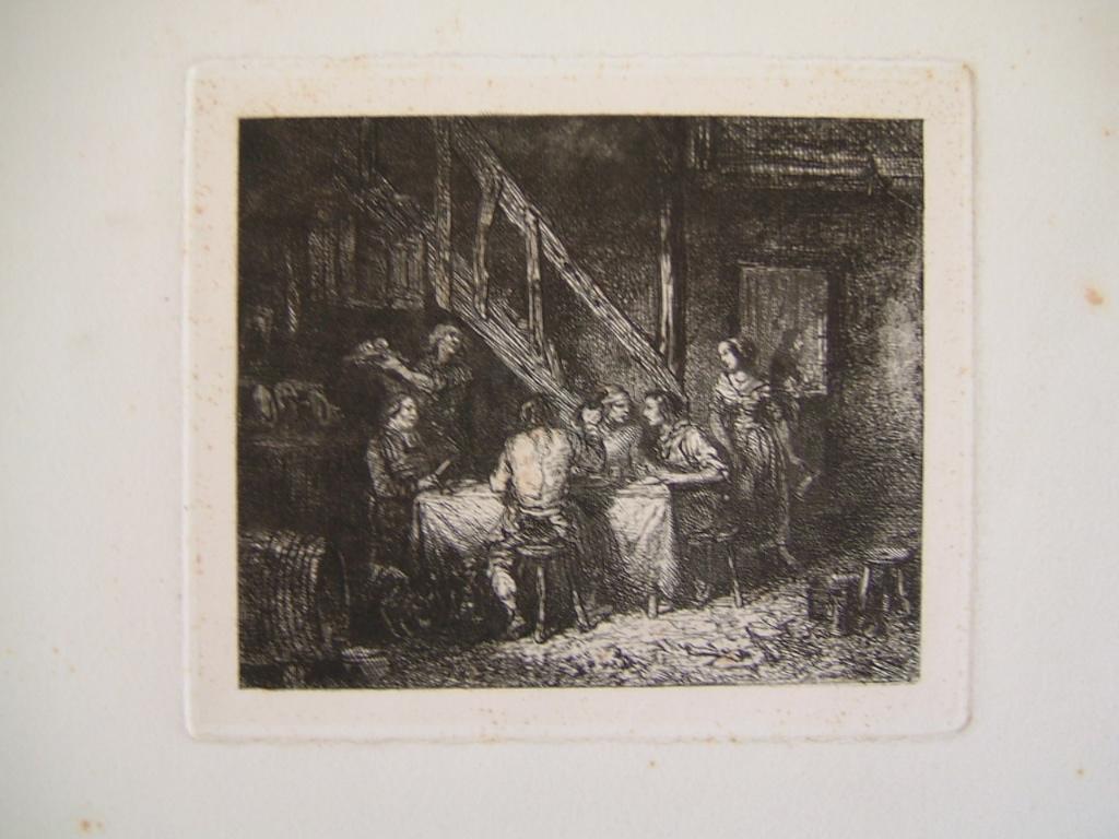 scène (grange, paysan, homme, femme, repas, chien, tonneau, servante, escalier)