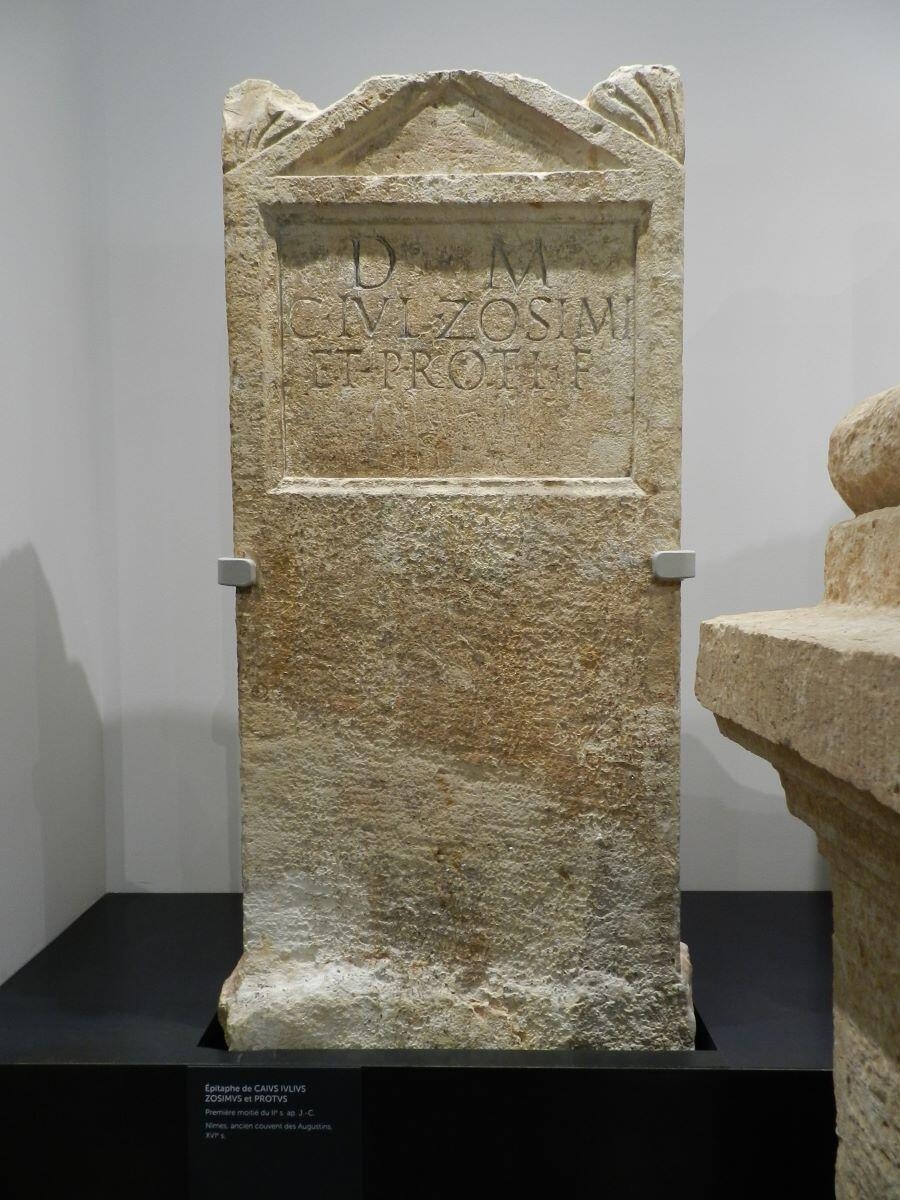 stèle rectangulaire à fronton triangulaire encadré de deux acrotères. Fronton et cartouche avec moulures d'encadrement. Traduction : "Aux dieux Mânes de Caius Iulius Zosimus et Protus fils (?)."