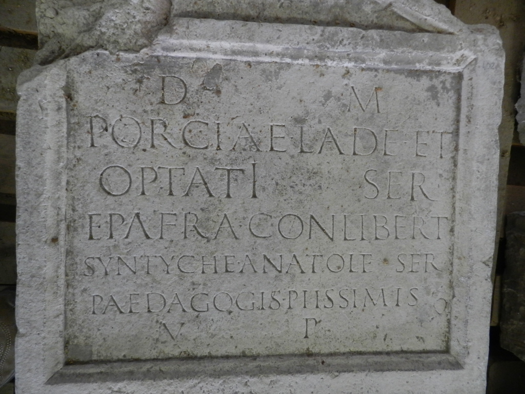 D M PORCIAE LADE ET OPTATI SER EPAFRA CONLIBERT SYNTYCHE ANATOLE SER PAEDAGOGIS PIISSIMIS V P