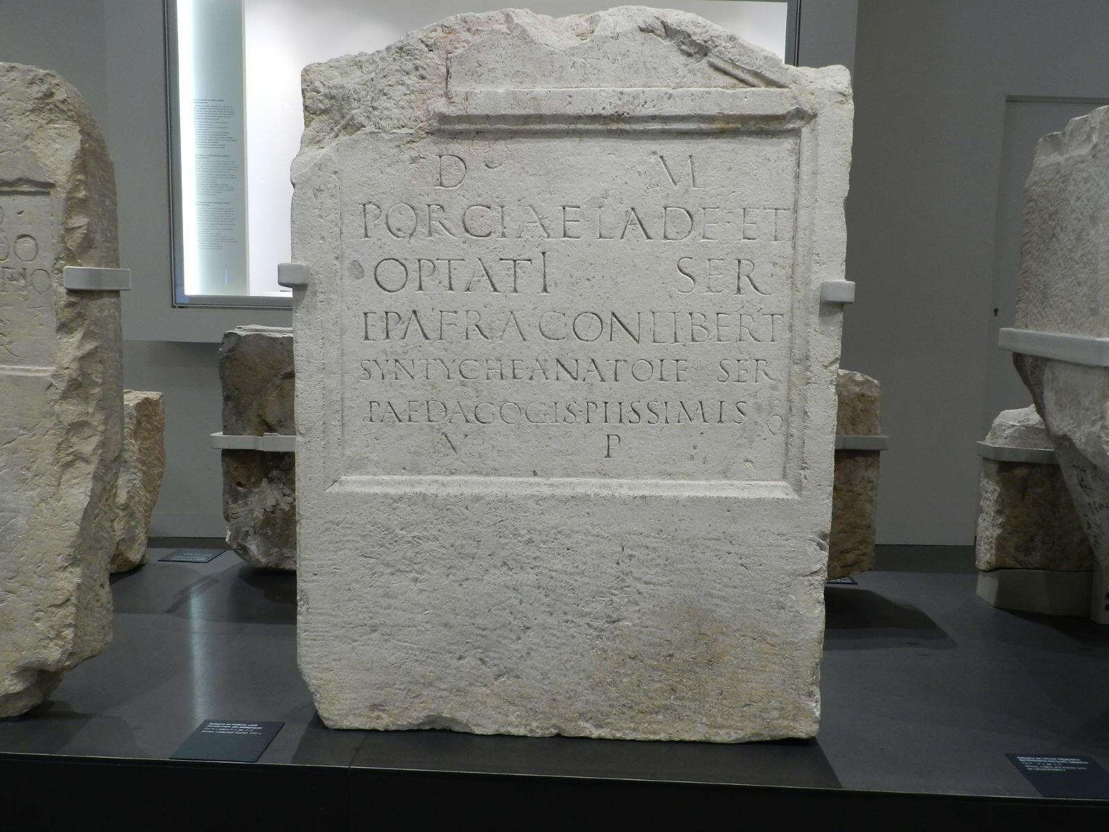 stèle à fronton triangulaire, brisée en partie inférieure. Inscription de sept lignes dans cartouche mouluré. Traduction : "Aux Dieux Mânes de Porcia Lade et Optatus son esclave. Epafra, son coaffranchi, Syntyché et Anatole esclaves ont de leur vivant élevé cette stèle pour ce précepteur plein d'attentions".