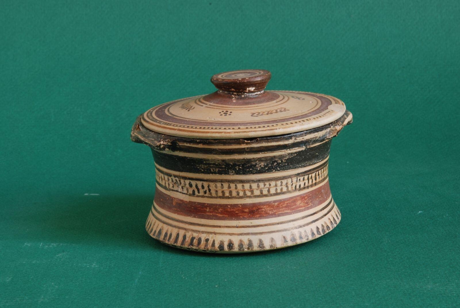Le corps est orné successivement depuis la base : d'une frise de languettes noires, de deux lignes noires, d'une bande rouge bordée de deux lignes pourpres, de deux lignes noires encadrant une double frise de gouttes ou de points, d'une large bande noire, de deux bandes noires plus fines. Le couvercle est orné depuis le bord : d'une ligne ocre, de deux lignes ocres fines encadrant une frise de points, d'une large bande pourpre bordée de deux lignesocre sombre, d'une ligne ocre sombre, d'une frise alternant un motif en zigzag et un motif de 7 points entourant un point central, de deux lignes ocres sombres, d'une large bande rouge. Le bouton est peint d'une bande noire sur sa base, puis en rouge ; la partie supérieure plate est ornée de deux cercles au contour fin encadrant un cercle au contour épais, de couleur pourpre.
