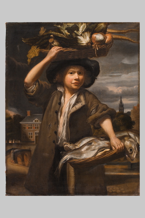figure ; adolescent ; vêtement (chemise ; veste ; chapeau) ; vannerie ; panier ; pêche ; poisson ; légume