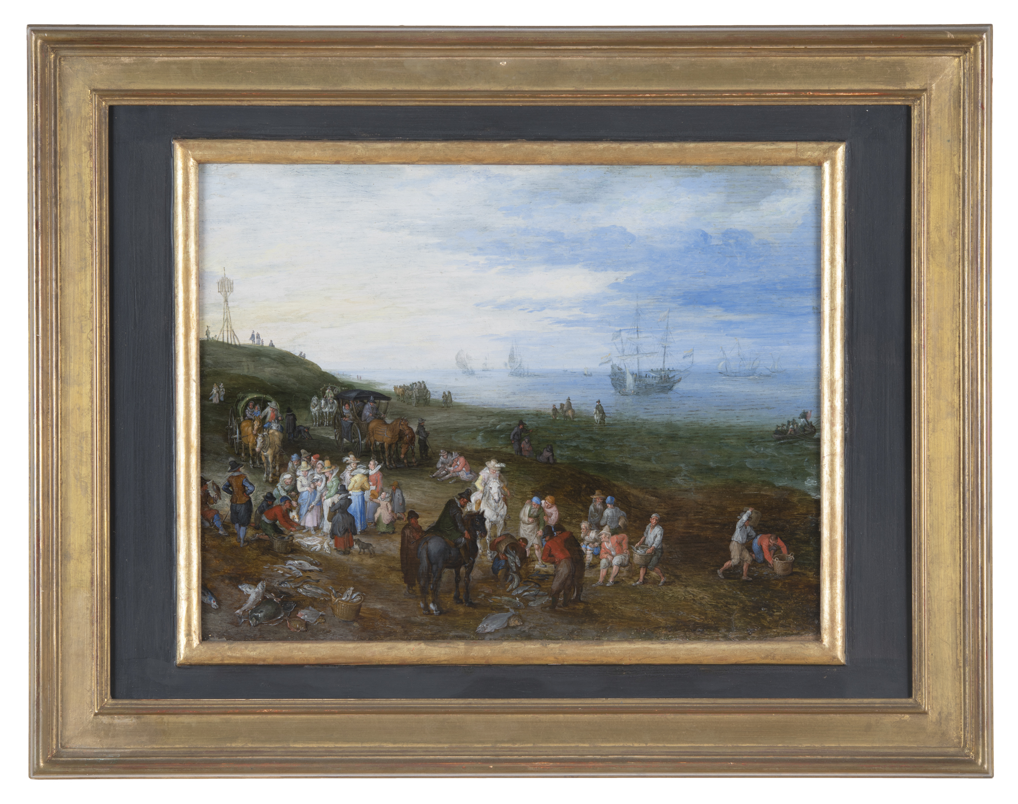 des pêcheurs vendent leurs poissons sur la plage que domine, à gauche, une hauteur surmontée d'une vigie. Au premier plan, un homme verse le contenu de sa corbeille devant deux personnages à cheval qui semblent faire un choix et d'autres qui regardent, assis ou debout. Au second plan, un pêcheur étale son poisson devant un autre groupe, celui-ci formé presque exclusivement de femmes, et plus loin, à différentes distances, des voitures arrivent ou s'en vont. La mer est au fond avec des barques et de grands navires.