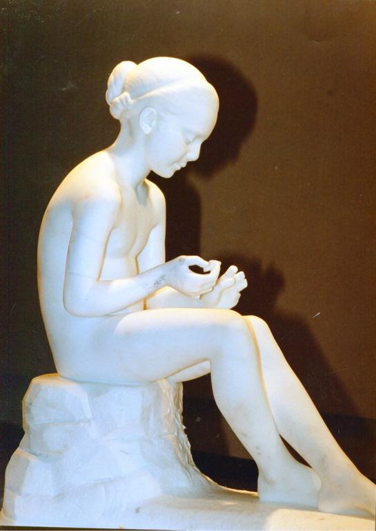 Une jeune fille nue au corps gracile, assise ; elle tient dans ses mains un petit escargot qu’elle regarde avec attention ; ses cheveux, tirés en arrière et retenus par un ruban, sont coiffés en chignon.