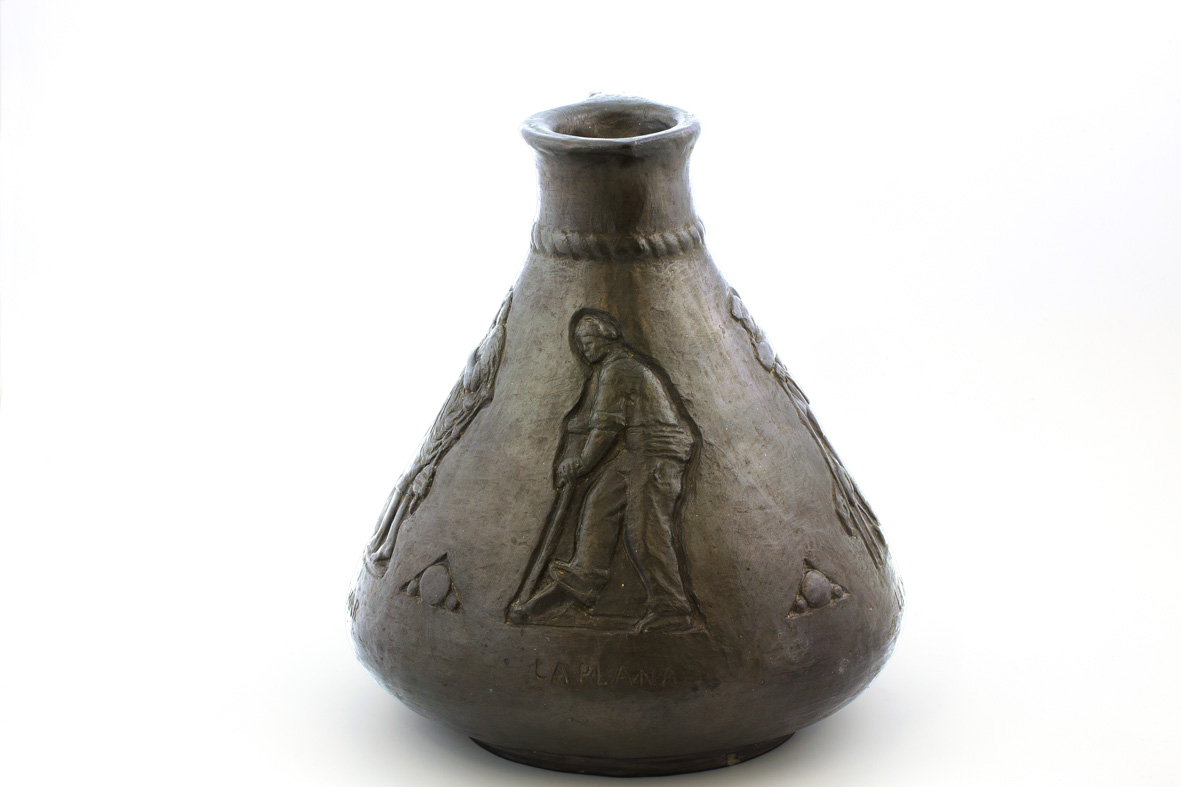 Une cruche en terre cuite noire patinée ; panse large et bombée, ornée de figures humaines - des paysans au travail, un homme à la bêche ; col étroit ; anse décorée.