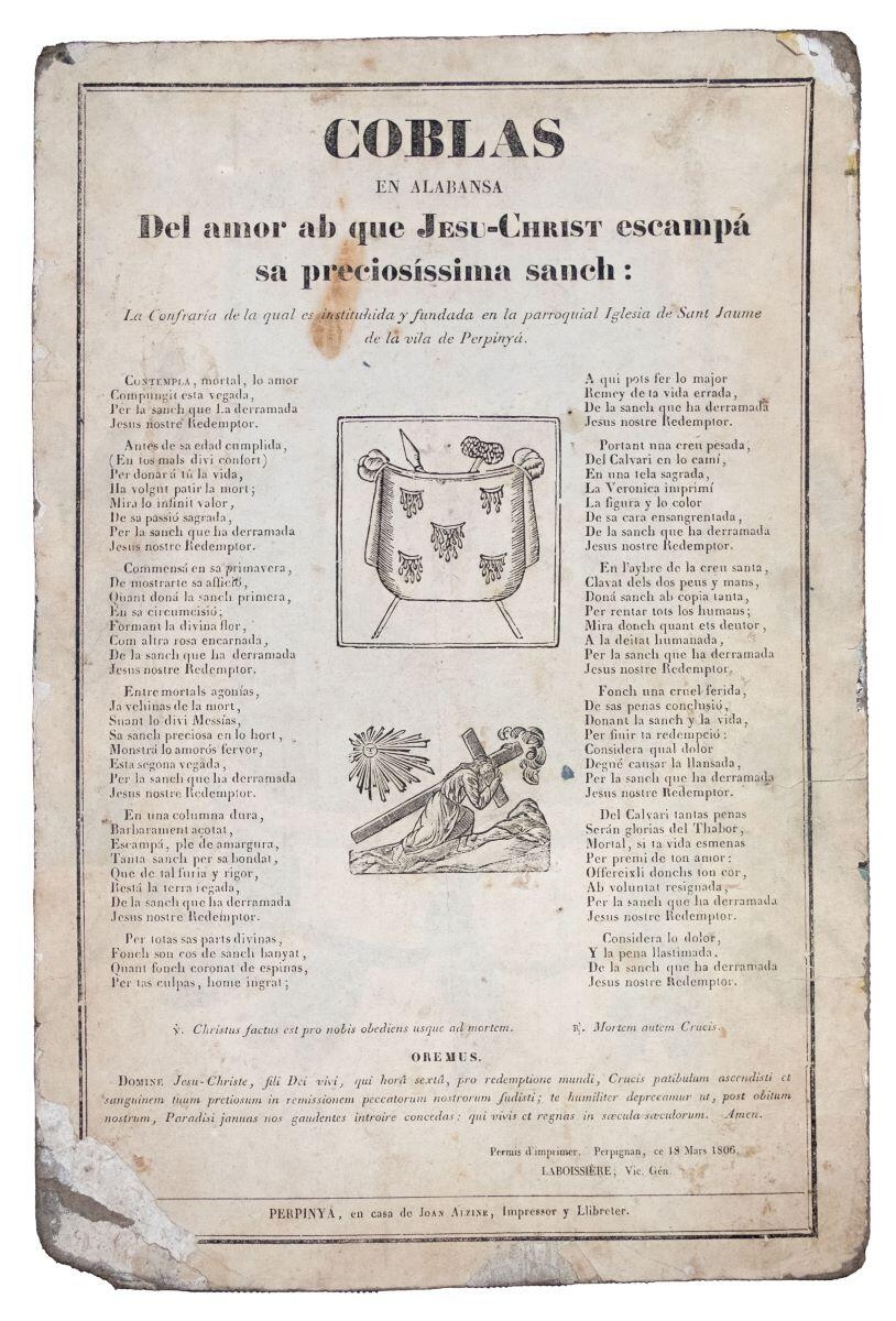 Coblas en alabansa del amor ab que Jesu-Christ escampà sa preciosissima sanch: la confraria de la qual es instituida y fundada en la parroquial iglesia de Sant Jaume de la vila de Perpinyà
