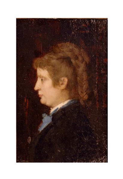 Clélia Leroux, épouse du peintre Louis Hector Leroux. Portrait en buste et de profil de Clélia Leroux, coiffée d'une tresse sur l'arrière de la tête, portant un vêtement noir avec un col blanc et une écharpe bleue.
