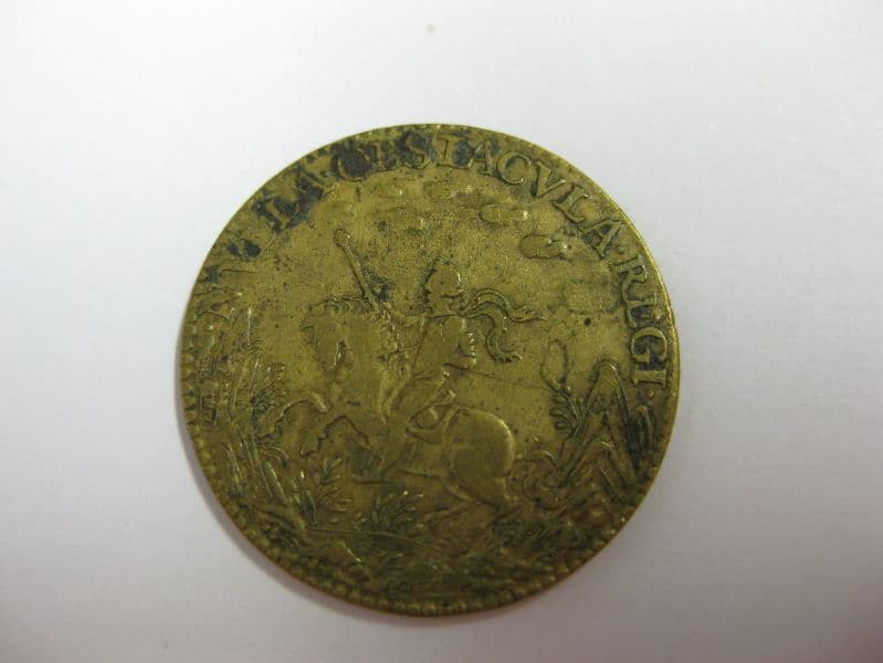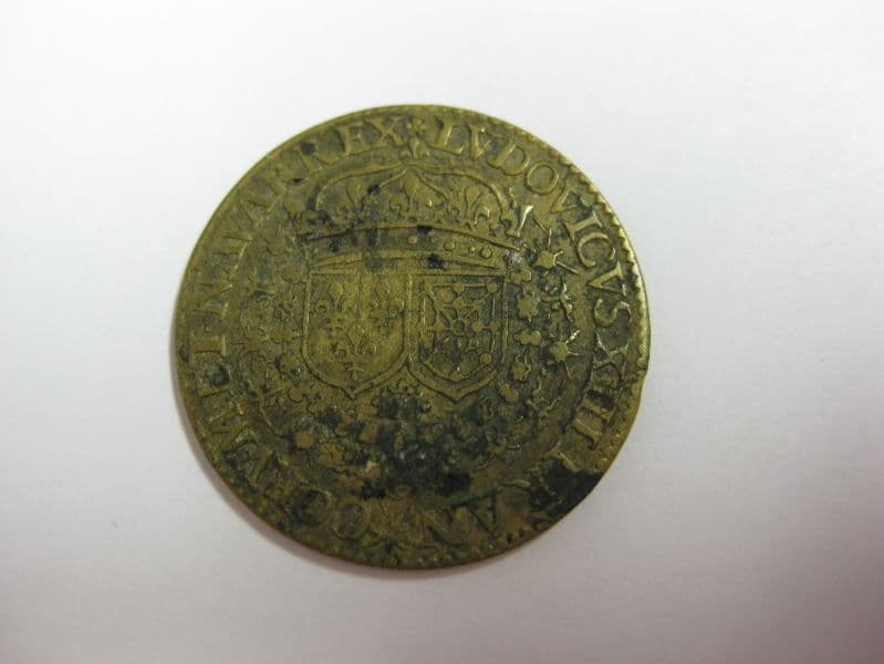 Avers : écus de France et de Navarre accolés, surmontés d’une couronne royale et entourés des deux colliers des ordres du roi ; entre les pointes des écus : L couronné. Revers : Louis XIII tenant le sceptre et montant un cheval galopant vers la droite.