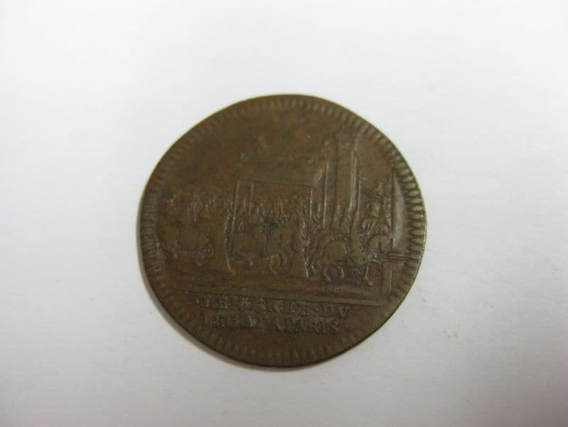 Avers : bustes affrontés de Louis XIV lauré, et Marie-Thérèse portant la couronne radiée. Revers : entrée du cardinal légat à Paris, à droite, sous un dais, entouré de son escorte ; exergue : L’ENTREE DU LEGAT A PARIS.