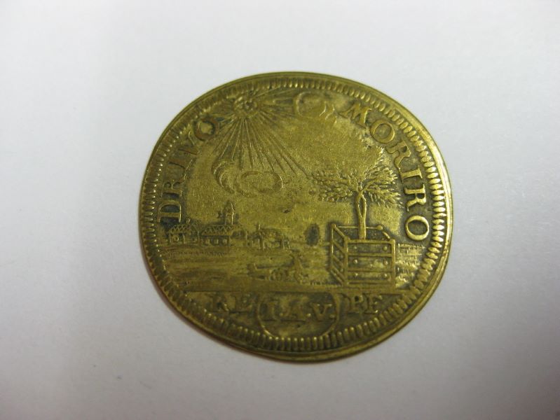 Avers : tête de Louis XV jeune, à droite, cuirassé, lauré et drapé. Revers : dans un paysage, au fond à gauche, deux maisons et une église ; au premier plan, à droite, un arbre dans une caisse et à gauche un laboureur conduisant sa charrue ; au-dessus, le soleil rayonnant ; exergue : RE (I.A.V) PF.
