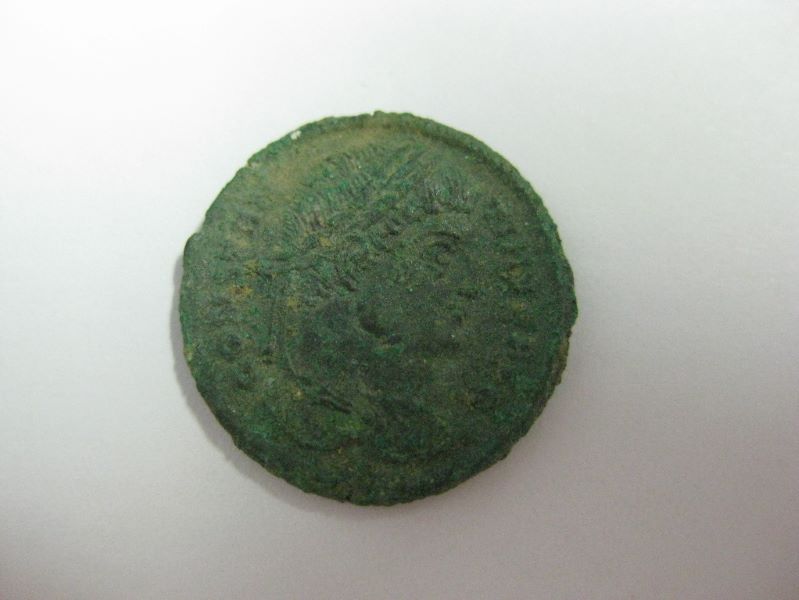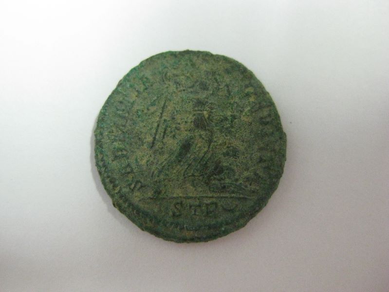 Avers : tête de Constantin, à droite, lauré. Revers : allégorie de la Victoire, marchant à droite, tenant un trophée de la main droite et une palme de la main gauche ; devant elle, un captif assis, retournant la tête ; exergue : STR (et un croissant).