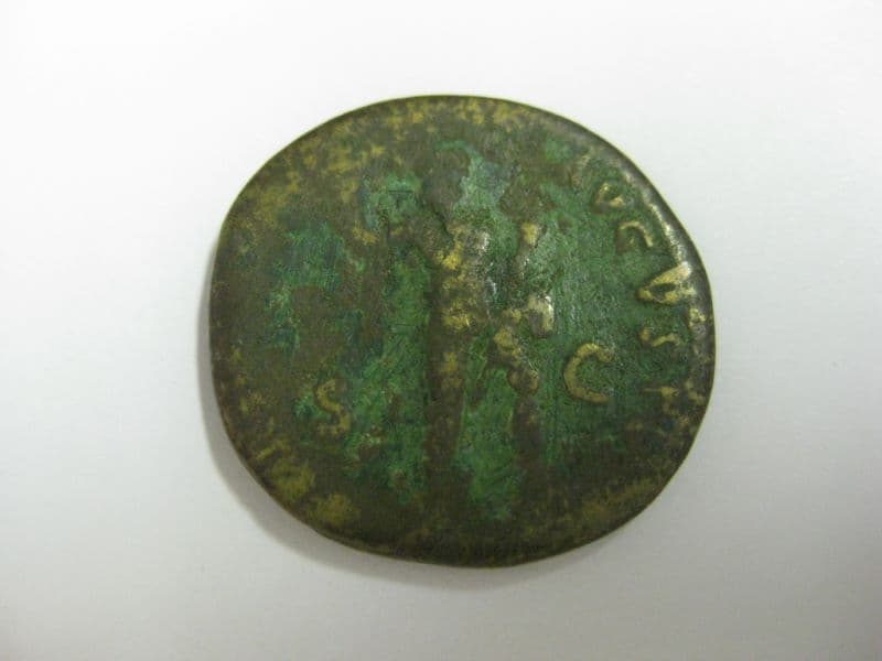 Avers : tête de Domitien laurée, à droite. Revers : la Vertu, debout à droite, le pied gauche sur un casque, tenant une lance de la main droite et une épée courte (ou parazonium) de la main gauche ; dans le champ : S C.
